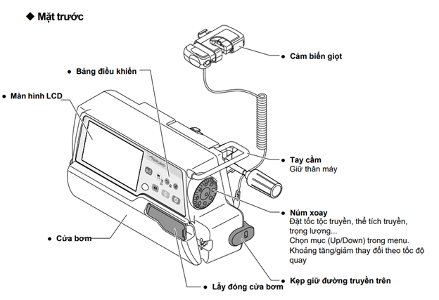 Hệ thống sử dụng áp lực đường truyền: Khi mở cửa bơm, kẹp đường truyền tự động kẹp vào dây truyền để tránh tình trạng truyền quá mức không chủ ý
